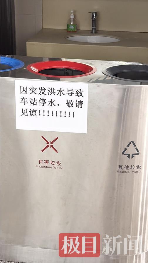 6月19日下午,极目新闻记者乘高铁赶到怀集站,此时站内工作运转正常,唯独站内的洗手间无法正常使用。记者看到,位于出站口附近的一处洗手间大门,已经被垃圾桶封堵,告示显示“因突发洪水导致车站停水敬请见谅”。